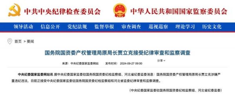 9月27日上午,中央纪委国家监委驻国务院国资委纪检监察组、河北省纪委监发布消息,国务院国资委产权管理局原局长贾立克涉嫌严重违纪违法,目前正接受中央纪委国家监委驻国务院国资委纪检监察组和河北省监委纪律审查和监察调查。